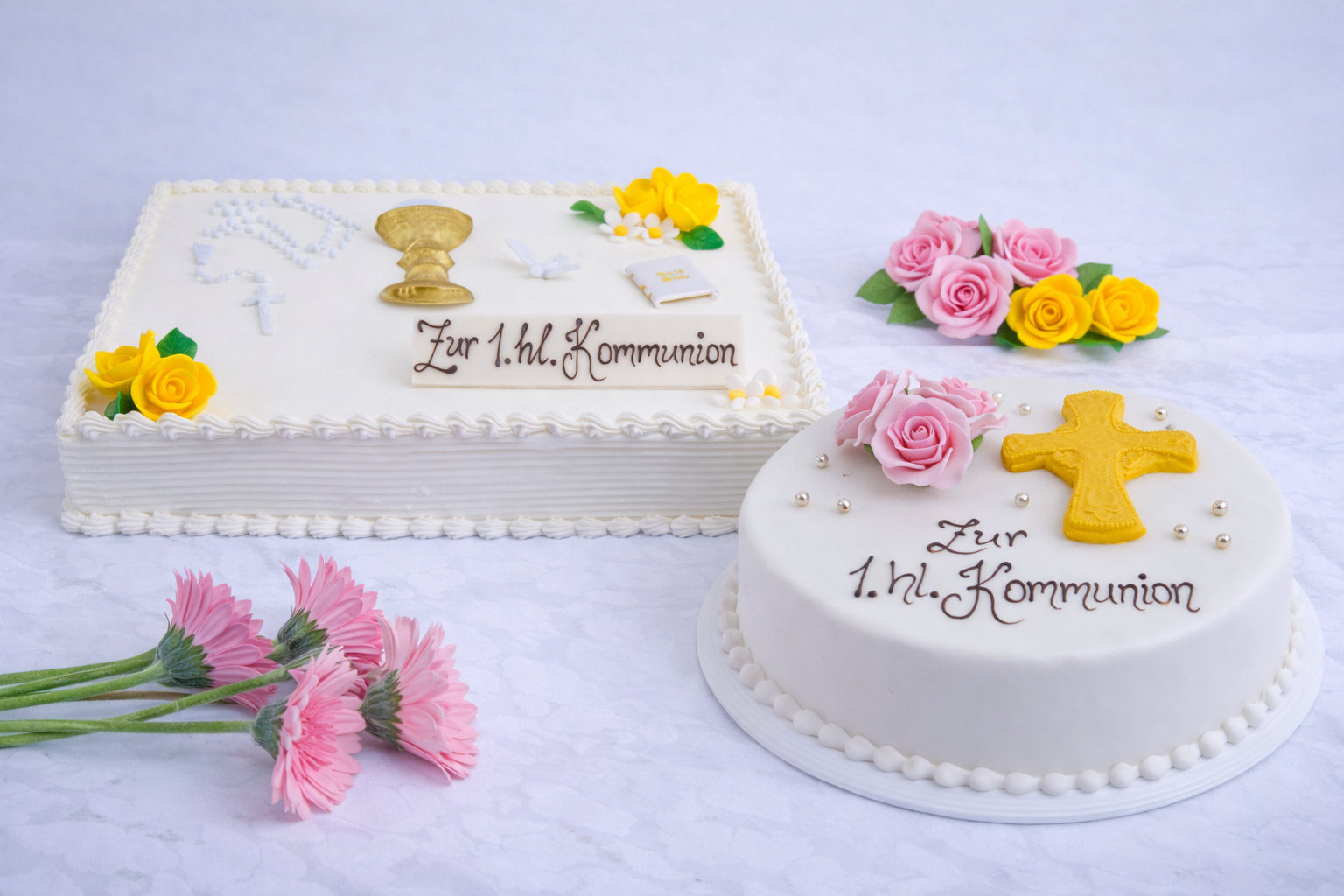 Unsere Kommunionstorten und Torten zur Firmung gibt es in verschiedenen Varianten – von schlicht und elegant bis hin zu etwas verspielteren Designs.