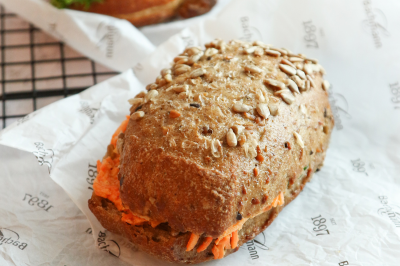 Auch für den schnellen Hunger zwischendurch bieten wir vegane Optionen wie unser bewährtes Klassiker-Sandwich Rüebli-Sprossen überzeugt mit frischen Rüebli, Gurken und Sprossen.