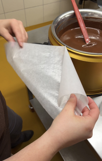 The first step begins with folding the piping cone. With it, we “make up” the Sternschnupperli in the mould. We pour liquid milk chocolate into the piping cone and fold it closed again. Then comes the decorating.