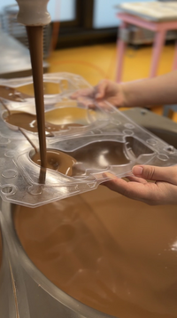 After the decorating comes the true feast for the eyes – a chocolate fountain with flowing, warm chocolate. With precise measurements, the liquid chocolate is poured into the mould. Next, both moulds, the back and the front, are joined together in the spinning machine.