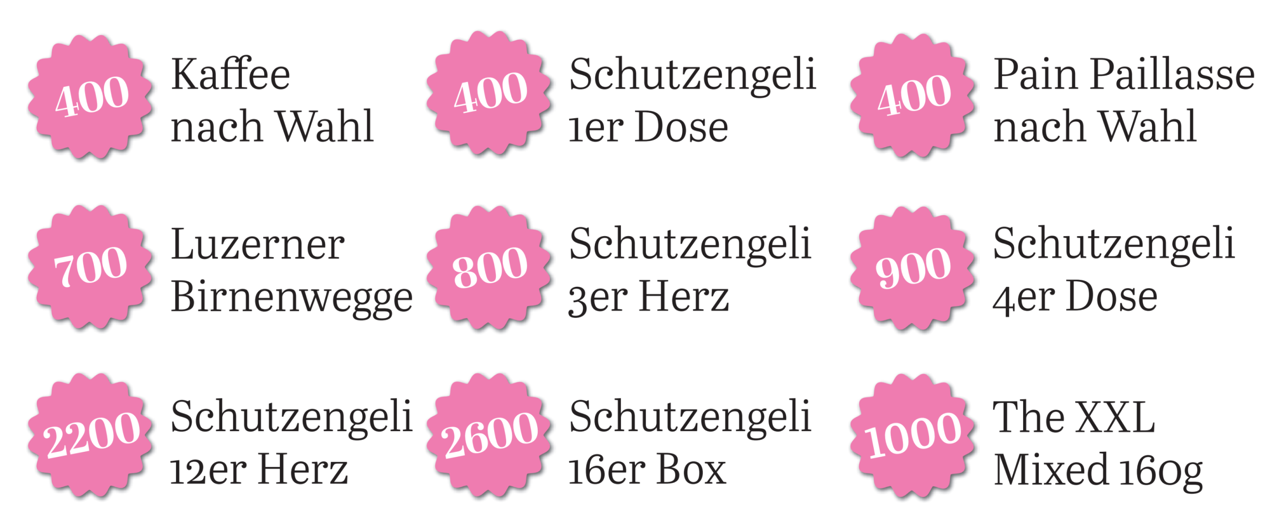 - 6 % auf alle Kaffeegetränke (gilt nicht für Aktionsangebot Café Crème & Gipfeli)