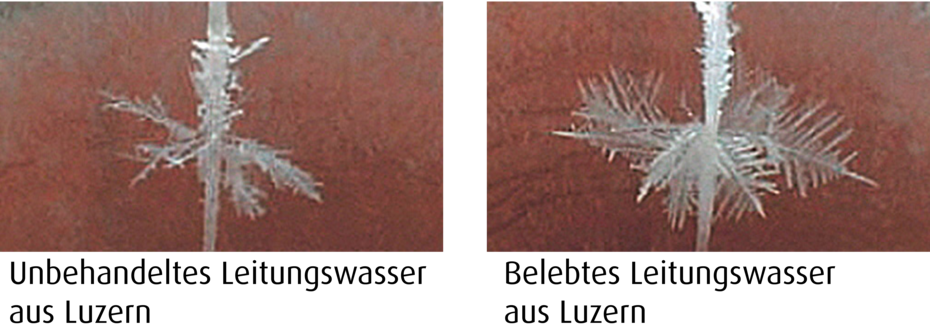 Die Energie im Wasser lässt sich übrigens bildlich festhalten: Hier der Vergleich zwischen unbehandeltem Leitungswasser und vitalisiertem Leitungswasser in Luzern.