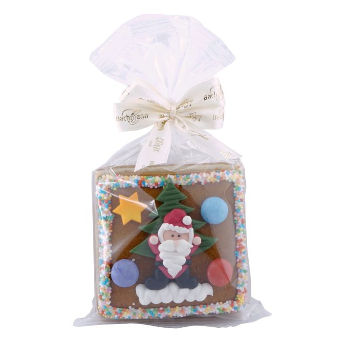 Biber Happy Chlaus –  Feiner Lebkuchen mit zarter Mandelmasse, abgerundet mit edlem Honig und winterlichen Gewürzen. Der liebevoll verzierte Chlaus verbindet traditionelles Confiserie-Handwerk mit festlichem Charme – ein kleiner Genussmoment, der Freude schenkt und Weihnachtsstimmung verbreitet. Im Cellosäckli verpackt mit einer goldenen Masche mit Bachmann Logo. Dieses fröhliche Weihnachtsguetzli bringt Kinderaugen zum Leuchten und ist ein echter Hingucker auf jedem Weihnachtstisch. Wenn du originelle Weihnachtsguetzli kaufen möchtest, ist der Biber Happy Chlaus genau das Richtige für dich.