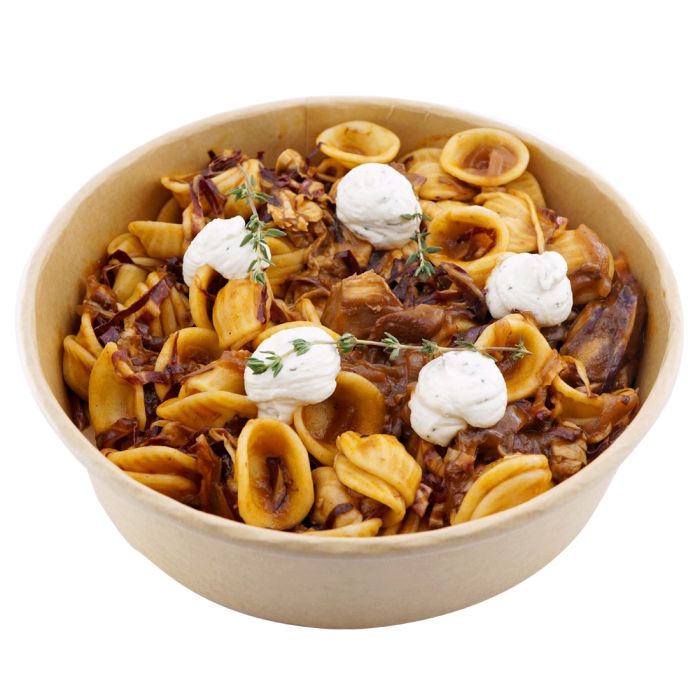 Zutaten: Pollo Vino 43% (Hühner-Bouillon (Salz, Stärke, Dextrose, Hühnerfleischextrakt, Speisewürze, Hefeextrakt, Aromen (Weizen), Rapsöl, Sojasauce getrocknet, Gewürze, Gewürzextrakt), Honorable, Porto Wein 19% Vol (Konservierungsmittel: Schwefeldioxid), Pouletfleisch (Schweiz), Zwiebeln, Rotwein (Sulfit), Doppel Tomatenmark, Saucenbinder (Weizenmehl, Palmöl, Farbstoff: Zuckerkulör), Alpensalz, Salz, Cayennepfeffer), Wasser, Orecchiette 19% (Hartweizengriess, Wasser), Pollo Vino Ricotta (Ricotta (Milch), Alpensalz, Thymian, natives Olivenöl extra), Thymian, Alpensalz, Chicoree rot
