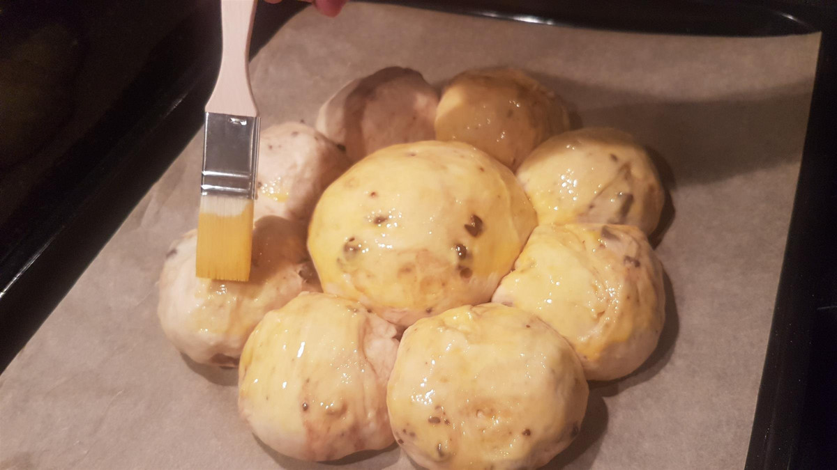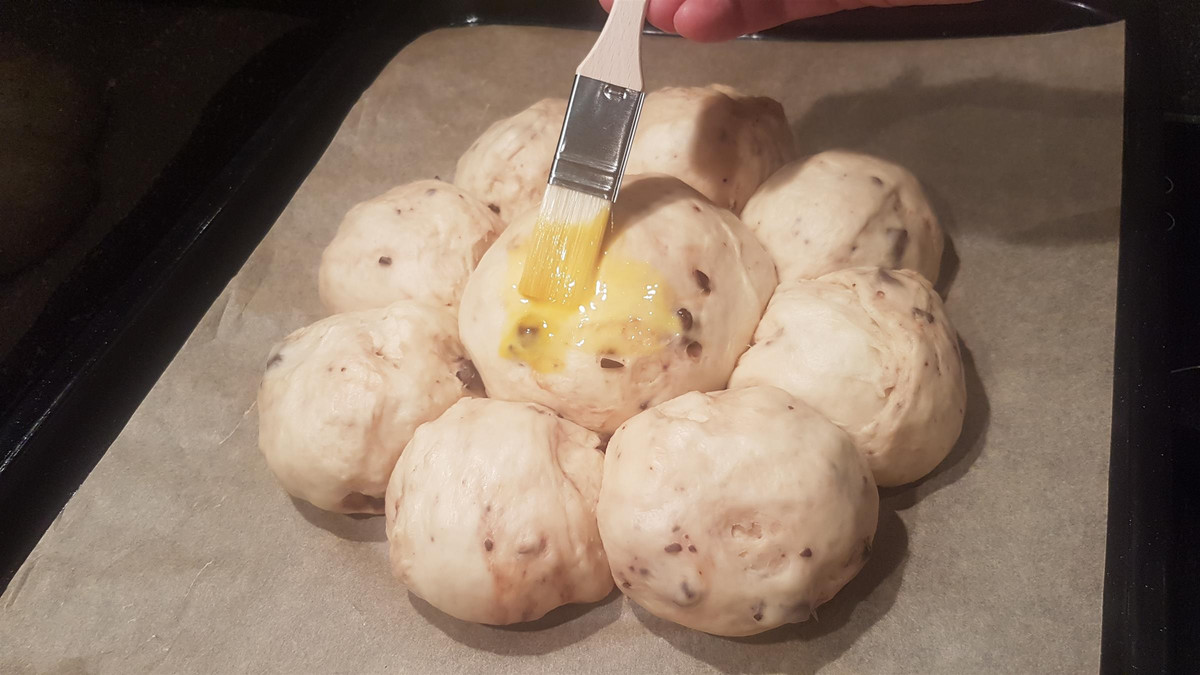 Teig nochmals zugedeckt aufs Doppelte aufgehen lassen. Aus einem Viertel Teig eine Kugel formen, auf das mit Backpapier belegte Blech setzen. Restlichen Teig in 8 Teile schneiden, Kugeln formen, dabei den König in einer Kugel verstecken. Teigkugeln mit wenig Abstand rund um die Mitte anordnen. Mit einem feuchten Tuch bedeckt 15 Minuten aufgehen lassen. Kuchen mit Ei bestreichen, und falls gewünsht mit Mandelblättchen und Hagelzucker bestreuen.