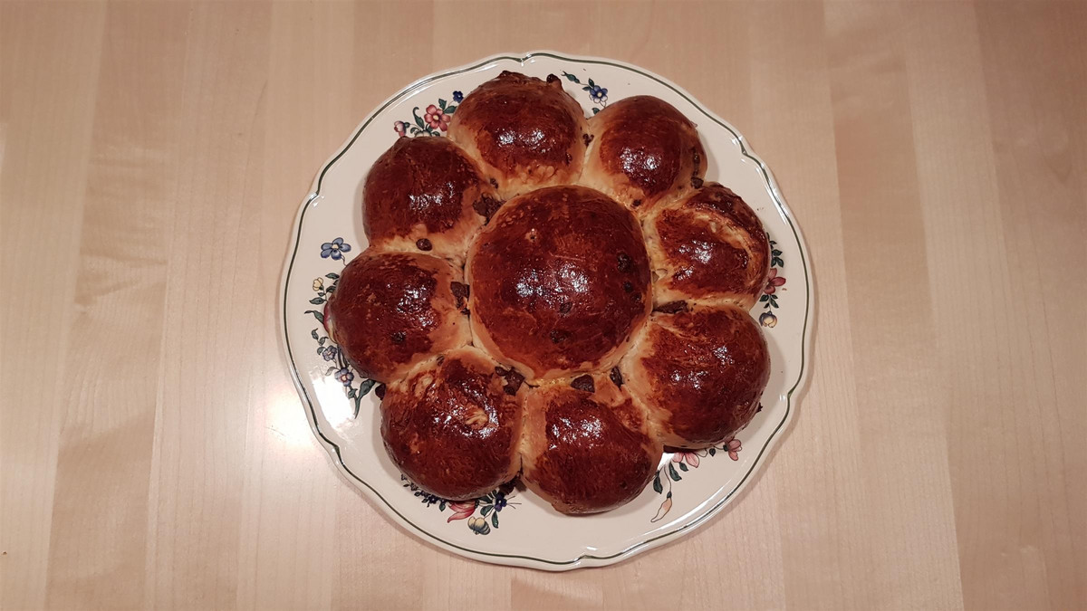 Mehl, Zucker und Salz mischen. Hefe in wenig Milch auflösen, mit restlicher Milch und Butter hineingiessen. Gut kneten zu einem  geschmeidigen Teig. Zugedeckt bei Raumtemperatur aufs Doppelte aufgehen lassen. Sultaninen abgiessen und gut abtropfen, vorsichtig unter den Teig kneten (oder  die Schokoladenstückli).