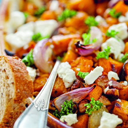 Die Kürbiswürfel in Olivenöl und Honig marinieren, in eine flache Form geben, die Zwiebeln hinzufügen und in den auf 210 °C vorgeheizten Backofen schieben. Nach 20 Minuten Garzeit mit einer Kelle wenden, mit Salz und Pfeffer abschmecken und die Baumnusskerne darüber streuen, erneut für 15 Minuten in den Backofen schieben. Feta und Peterli darüber verteilen. Mit Vollkornbrot servieren.