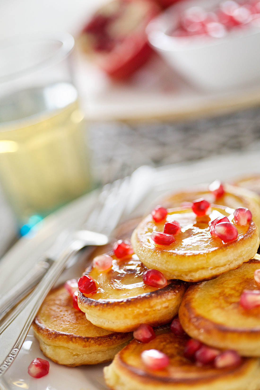 Die Kerne aus dem Granatapfel herauslösen und in eine Schüssel geben. In einer weiteren Schüssel Milch, Ricotta, Eier und Sonnenblumenöl verrühren. Mehl, Backpulver, Zucker, Vanillezucker und Salz vermischen, zur Eiermasse geben, glatt rühren, kurz stehen lassen, nochmals durchrühren und in Dressiersack füllen. Bratbutter in Bratpfanne erhitzen, beliebig grosse Pfannkuchen direkt in die Bratpfanne eindressieren, kurz anbraten, wenden, beidseitig goldbraun braten. Auf einer Platte anrichten, die Granatapfelkerne darüber streuen.