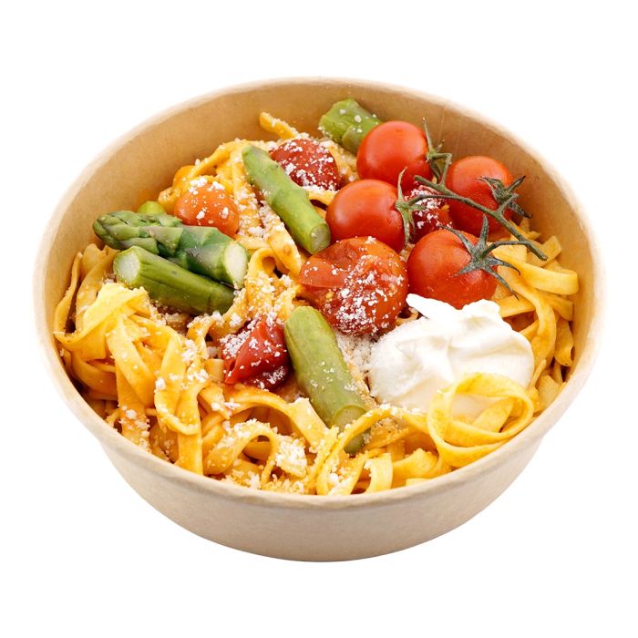 Zutaten: Taglietelle gekocht  (Wasser, Tagliatelle (Eier, Hartweizengriess), Alpensalz), Kirschtomaten  (Tomatensaft), Mini Burrata (Milch pasteurisiert, Vollrahm, Salz), Grünspargeln, Cherrytomaten, Grana Padano gerieben DOP, Natives Olivenöl extra, Rapsöl, Rohr-Rohzucker,  Pfeffer, Gewürzmischung Herbamare (Sellerie)