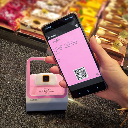 - Halten Sie für die Zahlung dann einfach den QR Code an unseren pinken Leser neben dem EC-Terminal.