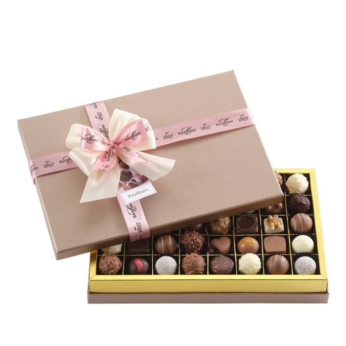40er Bonbonnière - Eine exquisite Auswahl von 40 handgefertigten Pralinés aus feinster Schweizer Schokolade. Die harmonische Mischung kombiniert cremige, nussige und fruchtige Sorten mit feinen Likörnoten.