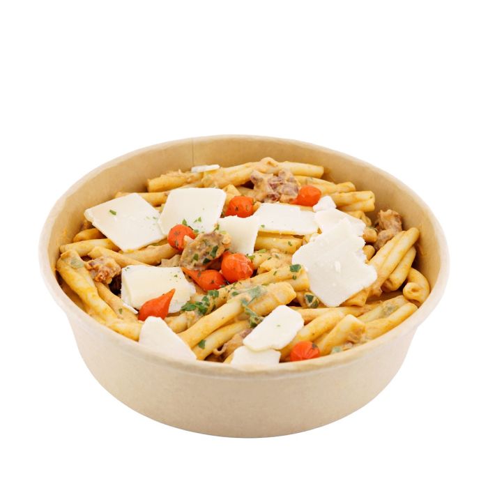 Zutaten: Casarecce Teigwaren (Hartweizengriess, Wasser), Frischkäse (Milch), Chorizo (Schweinefleisch (Schweiz), Speck, Rindfleisch (Schweiz), Wasser, Tomatenmark, Nitritpökelsalz (Kochsalz, Konservierungsmittel (Natriumnitrit)), Gewürze), Rotwein (enthält sulfit), Frühlingszwiebeln, Sonnengetrocknete Tomaten, Parmigiano Reggiano DOP (Milch), Peperoniperlen, Zwiebeln, Knoblauch, Petersilie, Alpensalz, Oregano