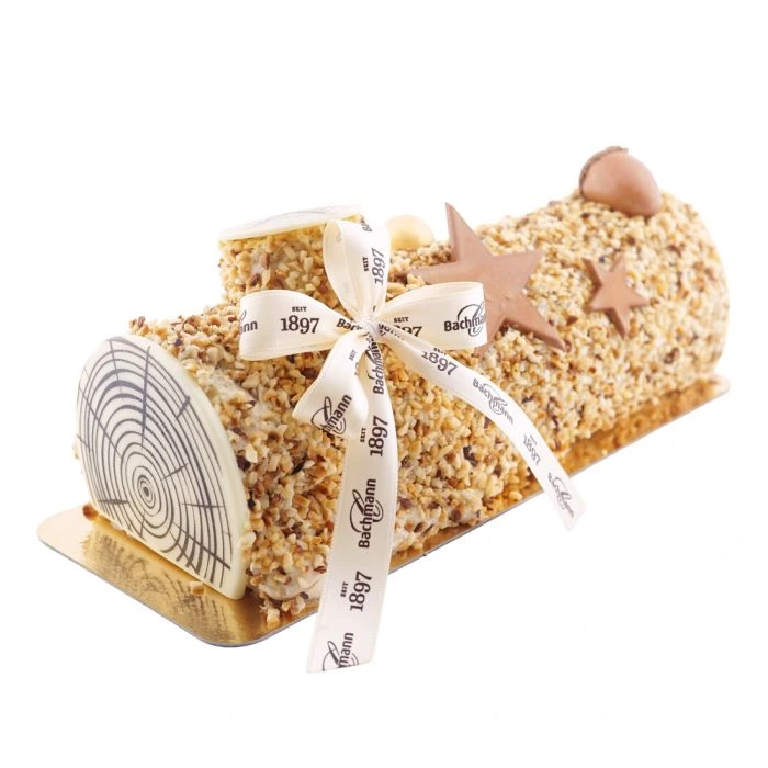 Zutaten: Butter, Zucker, Wasser, Haselnüsse, Eiweiss pasteurisiert, Haselnusspaste, Mandeln, Eigelb pasteurisiert, Weizenmehl, Pflanzliches fett, Vollmilch, Vollei pasteurisiert, Kakaobutter, Zimt, Vollmilchpulver, Kakaomasse, , Konservierungsmittel (Sorbinsäure), Meersalz, Verdickungsmittel (Johannisbrotkernmehl, Traganth), Milchzucker, Magermilchpulver, Emulgator (Sojalecithin, Sonnenblumenlecithin), Vanille, Farbstoffe (Riboflavin, Echtes Karmin, Titandioxid, Eisenoxide, Annatto, Silber, Pflanzenkohle), Malzextrakt, Aroma