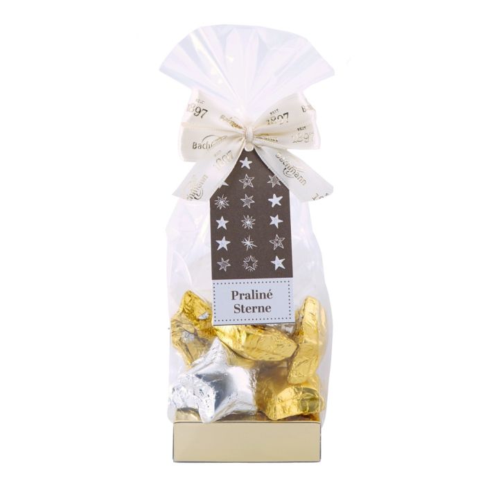Praliné stars mixed - Packed in a cello bag with a golden bow with Bachmann logo.