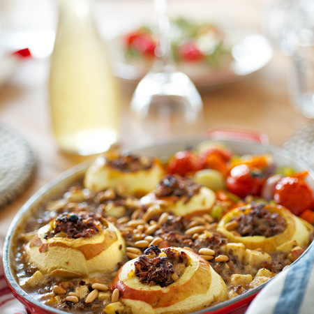 Heat the clarified butter in a frying pan, add the minced meat, brown well. Add and sweat the onion and garlic, besprinkle with flour, stir, deglaze with wine and bouillon, let it simmer. Add the sultanas and herbs, season with paprika, salt, pepper and cinnamon. Wash, core and hollow out the apples, leave a rim of 1,5 cm, place them side by side in a buttered casserole dish. Roughly chop the apple pieces that you removed and add them to the meat, briefly cook. Fill the apples with the meat filling, fill the remaining filling into the casserole dish, if necessary add a little bouillon. Place in the oven at 220 °C for around 20 minutes until the apples are done. Arrange on a plate, besprinkle with pine nuts. Serve e.g. with vegetables, wild rice or amaranth.