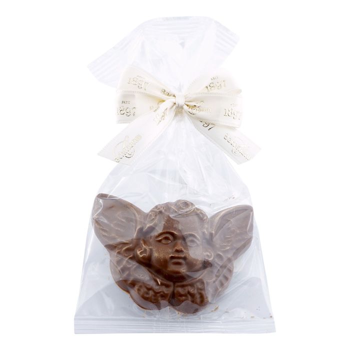 Schoggi Engel lait - Packed in a cello bag with a golden bow with the Bachmann logo.