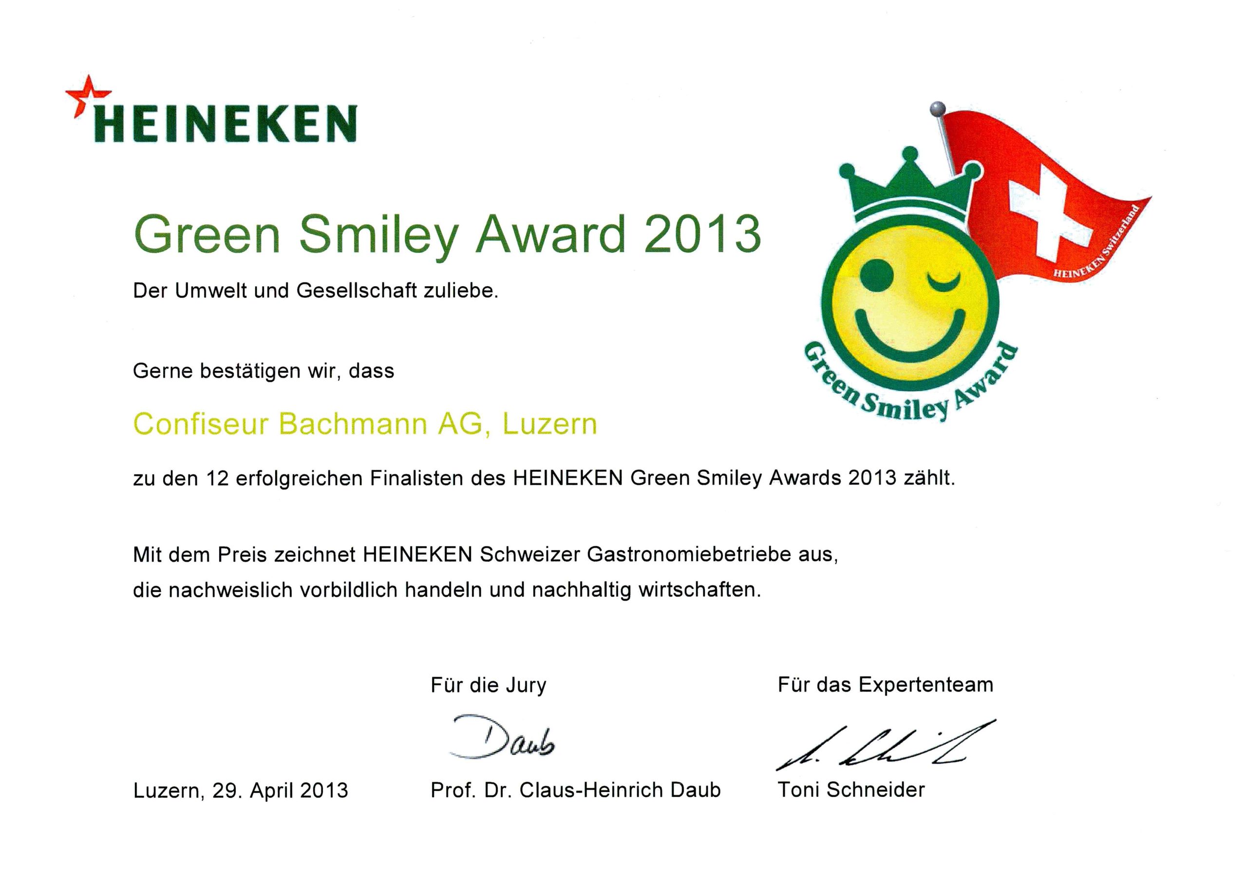 Im Rahmen von „Brewing a Better Future“ hat Heineken Switzerland im November 2011 den Green Smiley Award lanciert. Damit will das Unternehmen ihre Kunden in der Gastronomie aktiv in die unternehmerischen Nachhaltigkeitsbestrebungen einbinden. Der Galaabend fand am 29. März 2013 im Giardino Verde in Uitikon Waldegg statt.