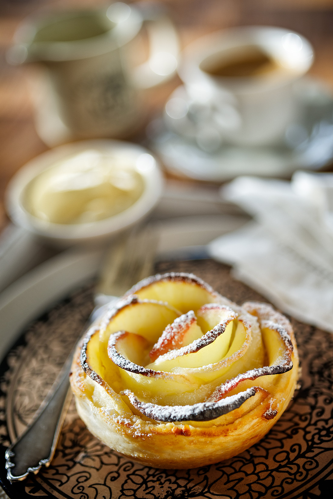Den Blätterteig auf 40 × 24 cm auswallen, auf Blech in den Tiefkühler geben. Das Wasser mit dem Zucker aufkochen, die gemahlenen Mandeln und die Zitronenschale beigeben, umrühren, erkalten lassen. Das Eiweiss darunter mischen, bis eine streichfähige Masse entsteht. Die Äpfel waschen, grob schälen, halbieren, entkernen und in 2 bis 3 mm dicke Scheiben schneiden. Den Apfelsaft zum Kochen bringen, die Apfelscheiben portionenweise kurz blanchieren, erkalten lassen. Die Mandelmasse dünn auf den gefrorenen Blätterteig aufstreichen. Streifen von 4 × 40 cm schneiden, die Apfelscheiben leicht überlappend bis zur Hälfte jedes Streifens auflegen, dann die andere Hälfte des Streifens darüberlegen und vorsichtig zu Rosen aufrollen. In ausgebutterte Formen, 10 cm Ø, geben. Bei 220 °C etwa 15 Minuten backen. Mit Staubzucker bestäuben und noch warm zusammen mit Vanillesauce servieren.