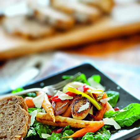 Alle Rüebli schälen, halbieren und in einer Pfanne leicht gar dünsten, beiseite stellen. Die Zwiebeln der Länge nach halbieren. Den jungen Krautstiel in die einzelnen Blätter aufteilen und kurz im heissen Salzwasser blanchieren, im kalten Wasser abschrecken. In einer Bratpfanne die Rüebli mit den Zwiebeln anrösten, bis das Gemüse Farbe annimmt; beiseite stellen. Zuerst den Krautstiel, anschliessend die übrigen Zutaten zu einem Salatteller zusammenstellen. Für die Sauce alle Zutaten mischen, über den Salat träufeln. Baumnüsse und den Sbrinz darüber verteilen.