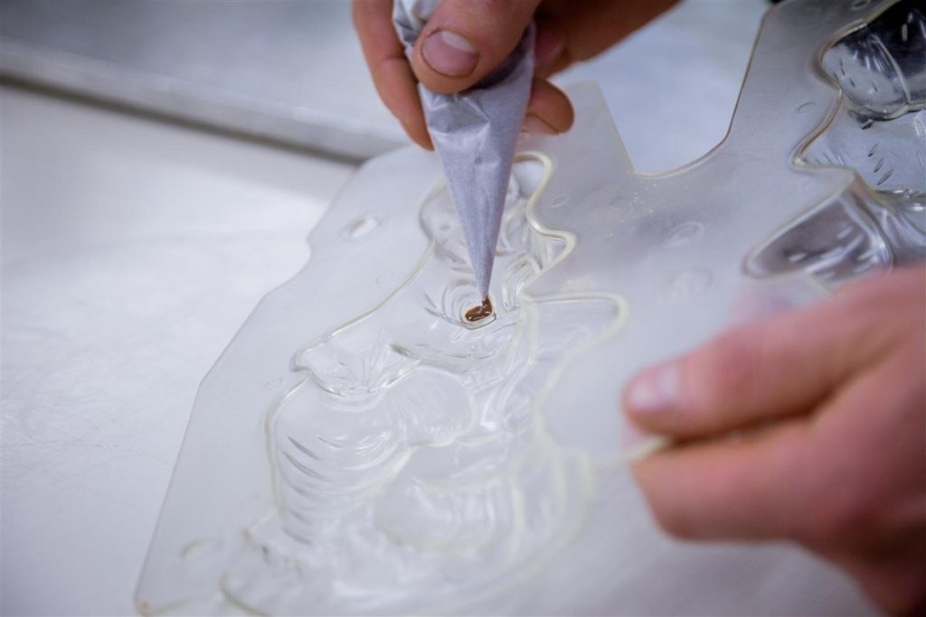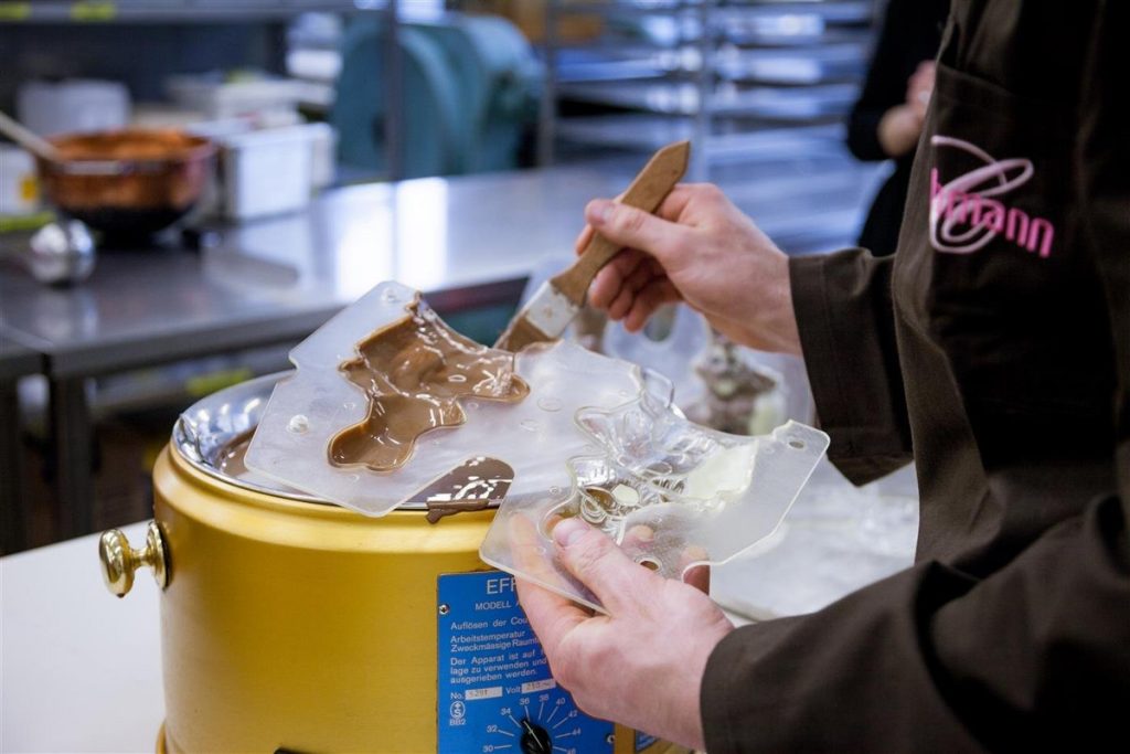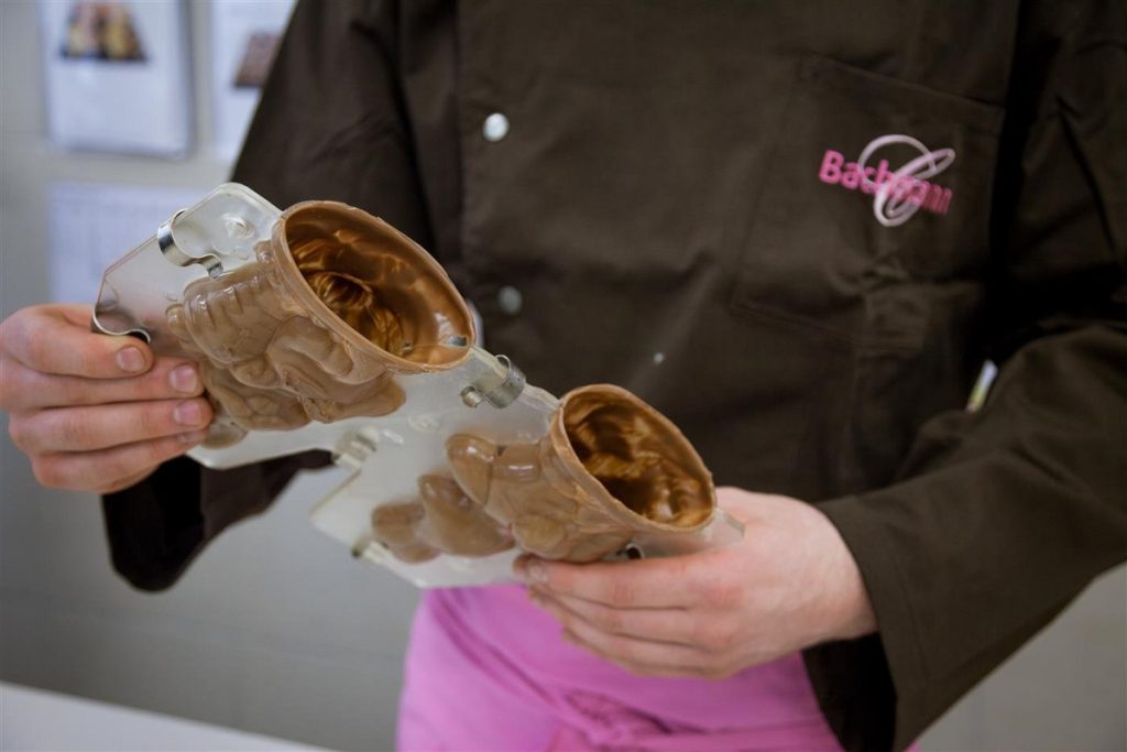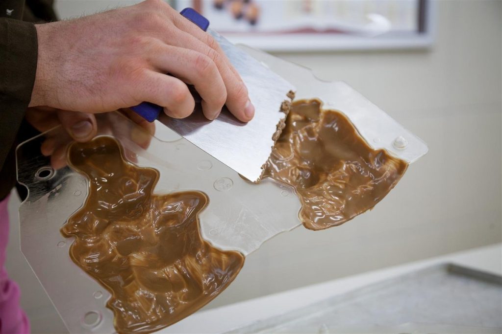 Danach wird ausgepinselt. Damit wird sichergestellt, dass auch die kleinste Ritze der Form mit Schokolade ausgefüllt wird. Wenn beide Seiten fertig ausgestrichen sind, werden die beiden Formhälften zusammengefügt und mit Klammern arretiert. Jetzt beginnt der eigentliche Giessvorgang. Mit einer Kelle wird die flüssige Schokolade bis an den oberen Rand eingefüllt, um dann gleich wieder ausgeleert zu werden. Die Form wird geklopft, so dass keine Luftblasen auf der Oberfläche entstehen. Der Giessvorgang wird 2-3 mal wiederholt, somit entsteht eine zartschmelzende dünne Schokoladenschicht.