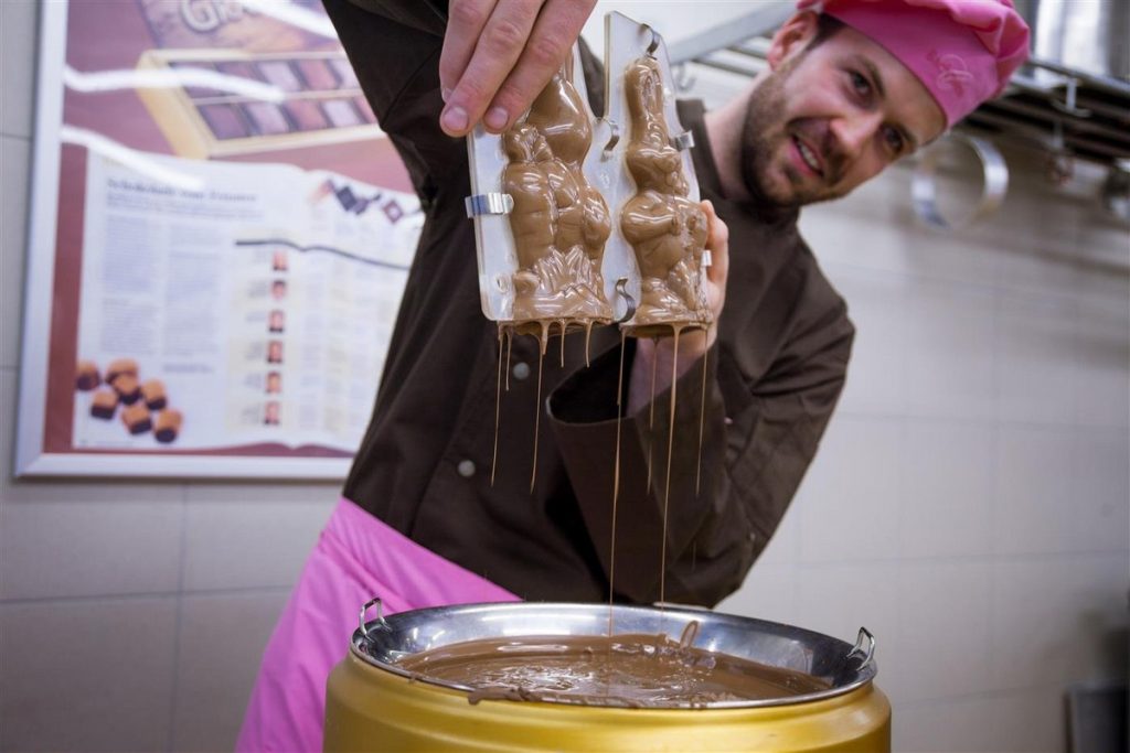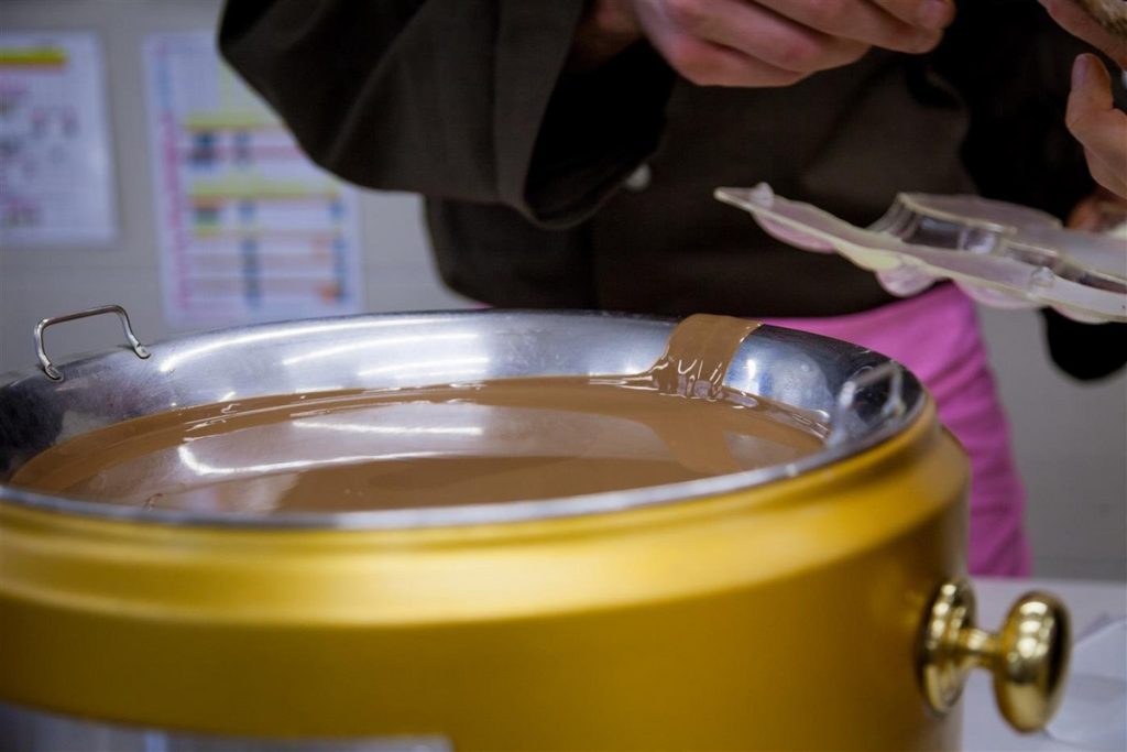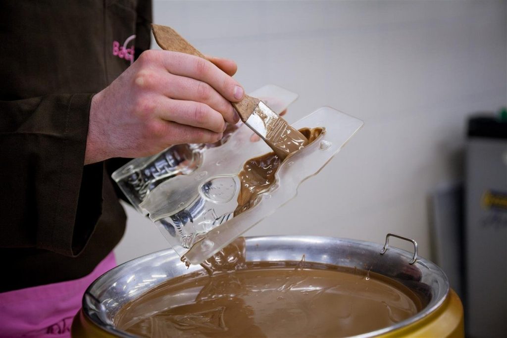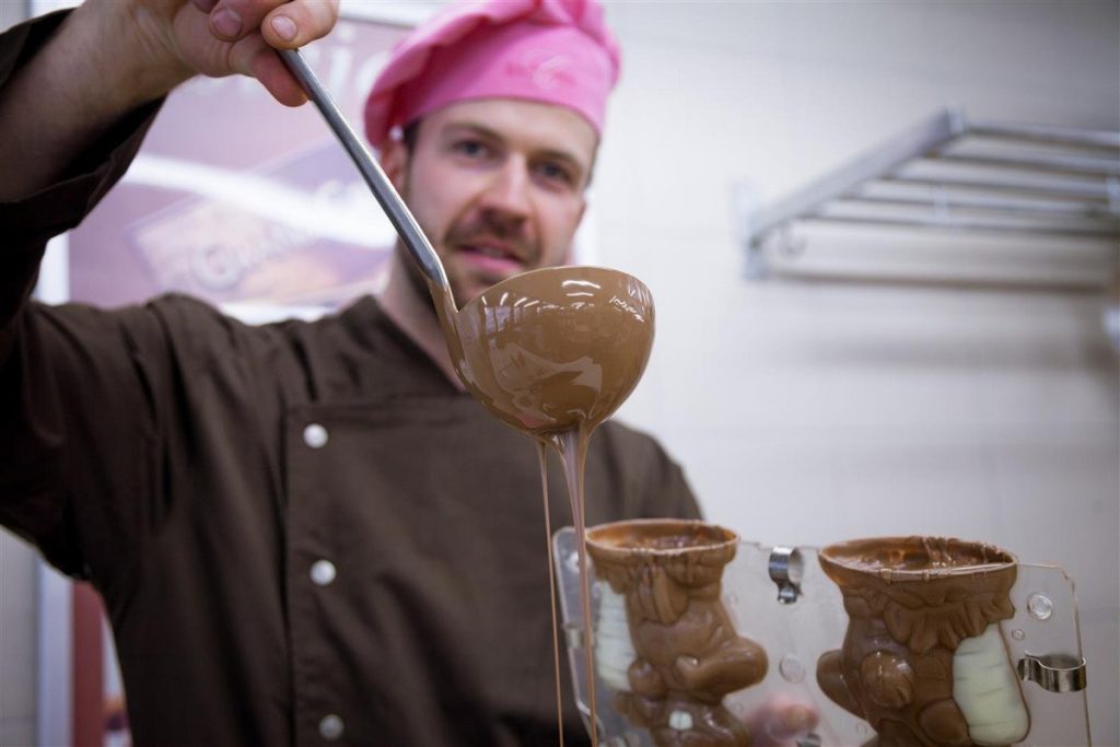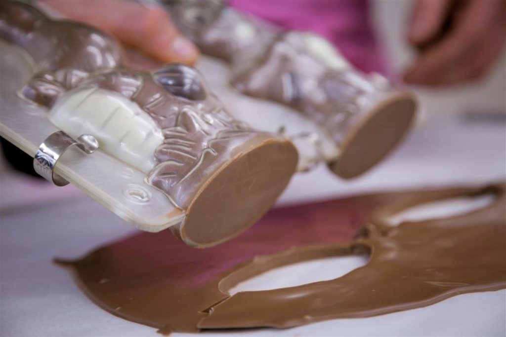 Danach wird ausgepinselt. Damit wird sichergestellt, dass auch die kleinste Ritze der Form mit Schokolade ausgefüllt wird. Wenn beide Seiten fertig ausgestrichen sind, werden die beiden Formhälften zusammengefügt und mit Klammern arretiert. Jetzt beginnt der eigentliche Giessvorgang. Mit einer Kelle wird die flüssige Schokolade bis an den oberen Rand eingefüllt, um dann gleich wieder ausgeleert zu werden. Die Form wird geklopft, so dass keine Luftblasen auf der Oberfläche entstehen. Der Giessvorgang wird 2-3 mal wiederholt, somit entsteht eine zartschmelzende dünne Schokoladenschicht.