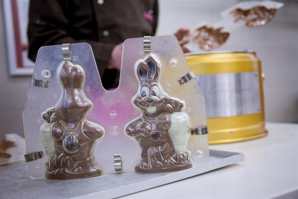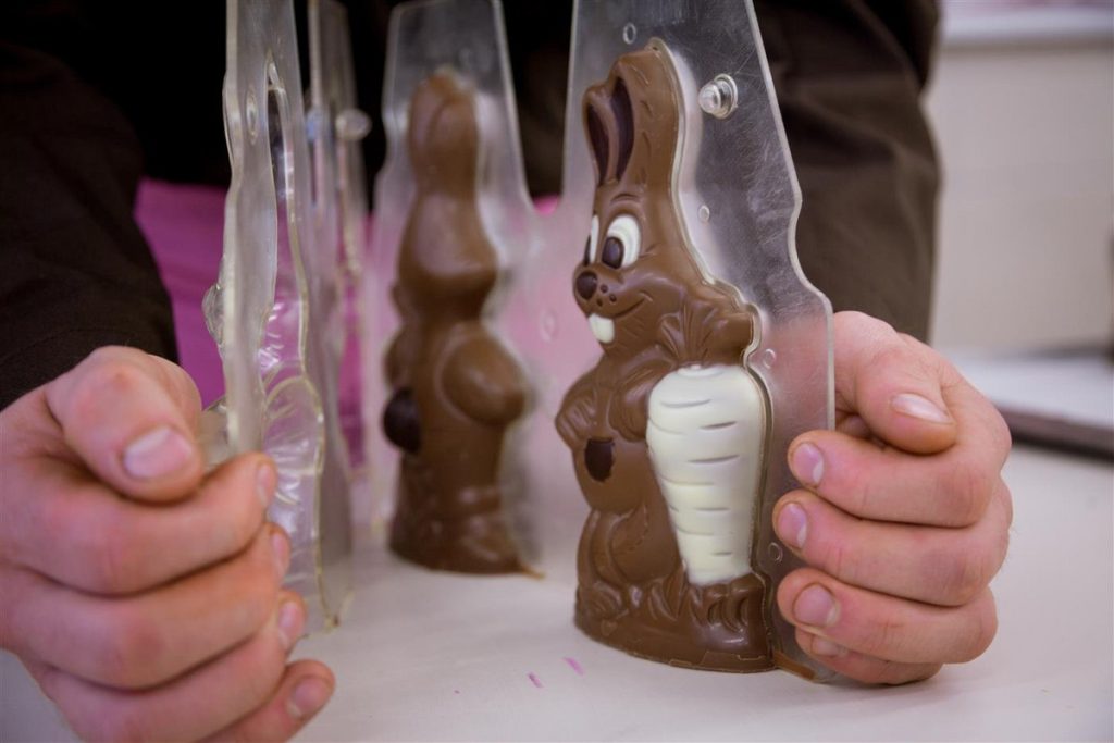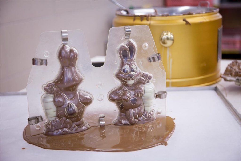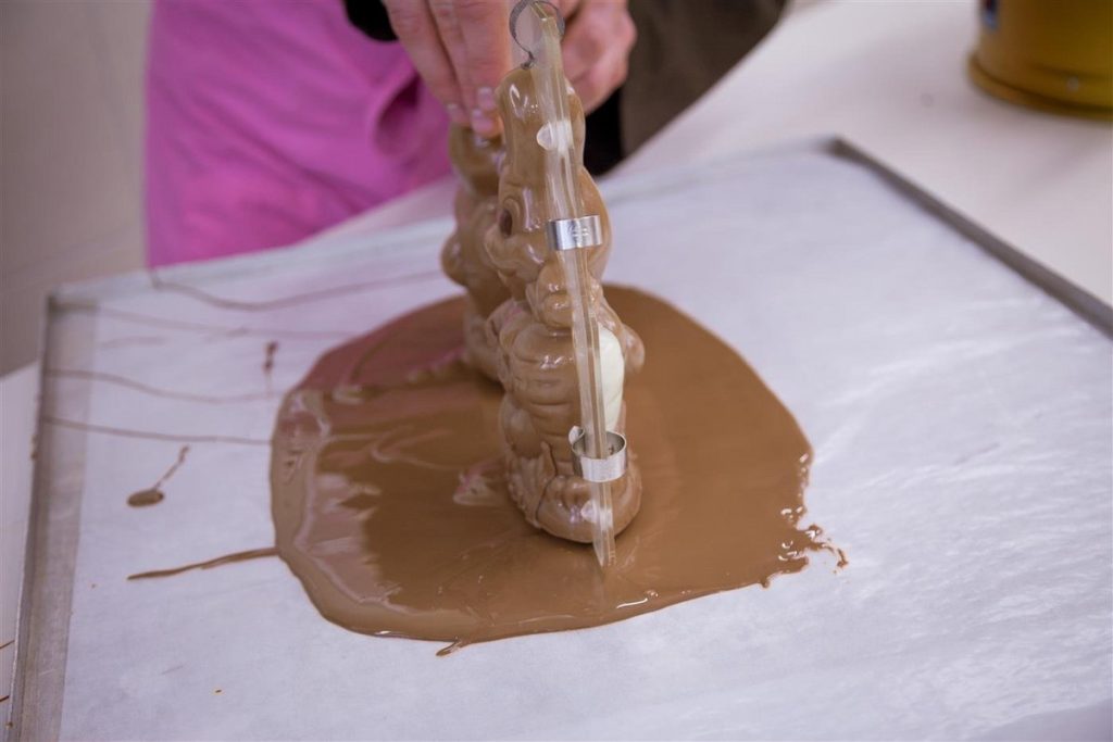 Die Couverture (Fachbegriff für Qualitässchokolade) muss zuerst temperiert (auf 45°C erwärmt, auf 27° abgekühlt und auf 32°C erwärmt) werden und auf 32°C gehalten werden. Die beiden Formhälften werden sauber mit Watte geputzt. Der Osterhase bekommt aus weisser und dunkler Schokolade ein Gesicht und Konturen. Im Fachausdruck nennt man diesen Arbeitsprozess schminken.