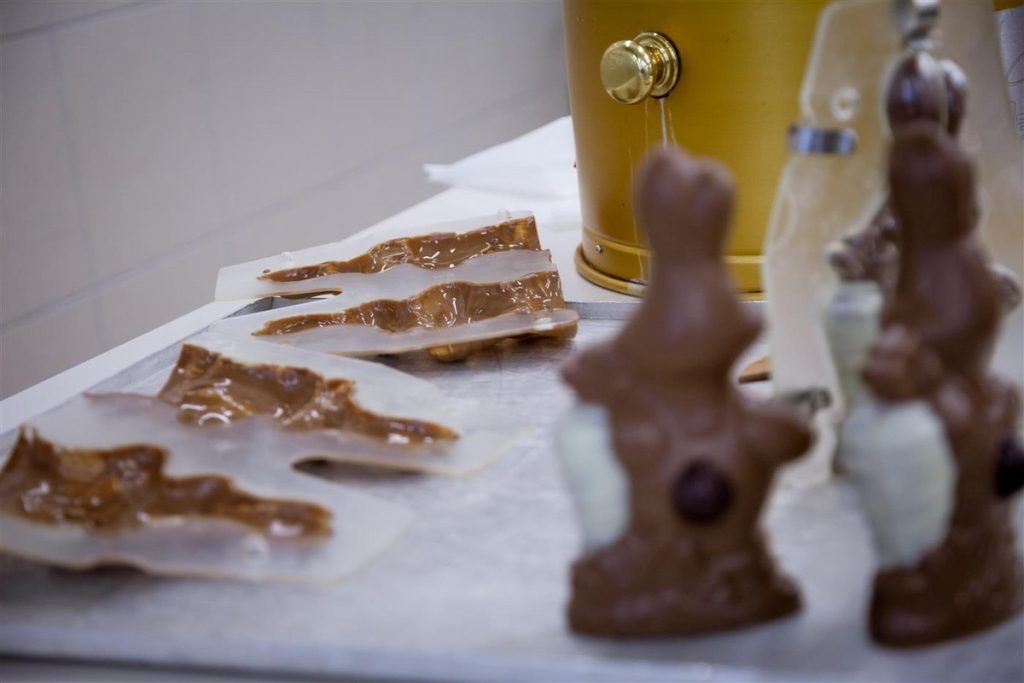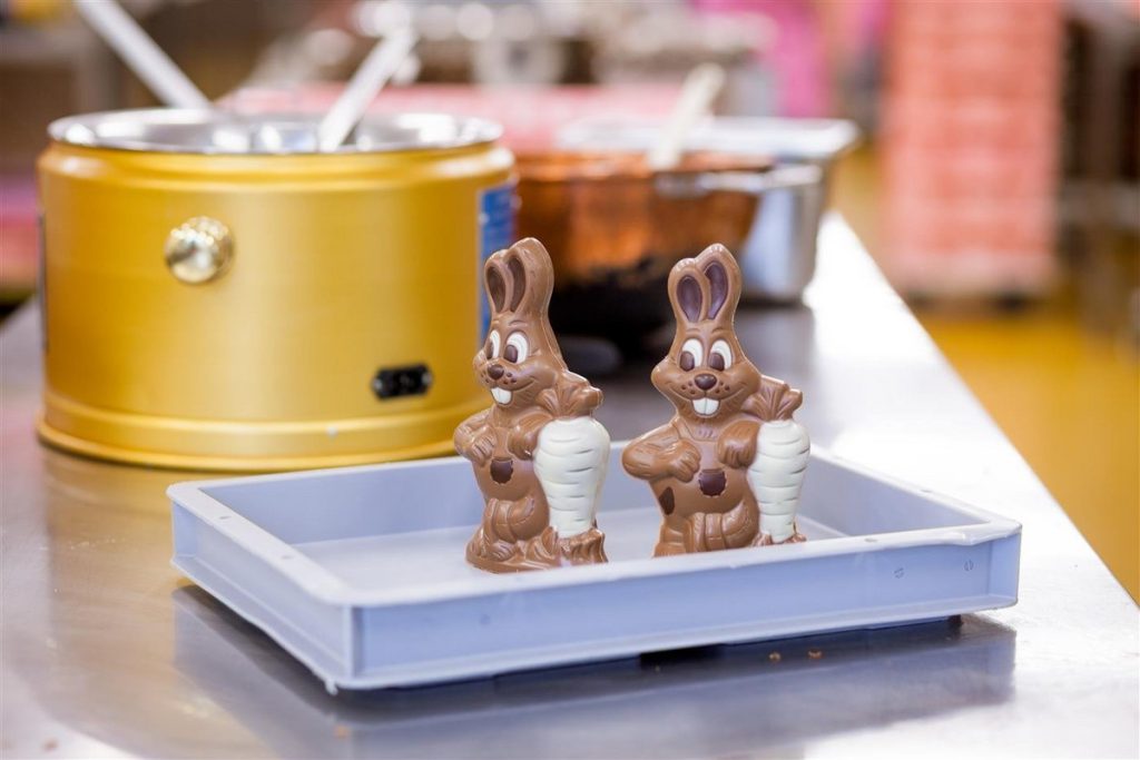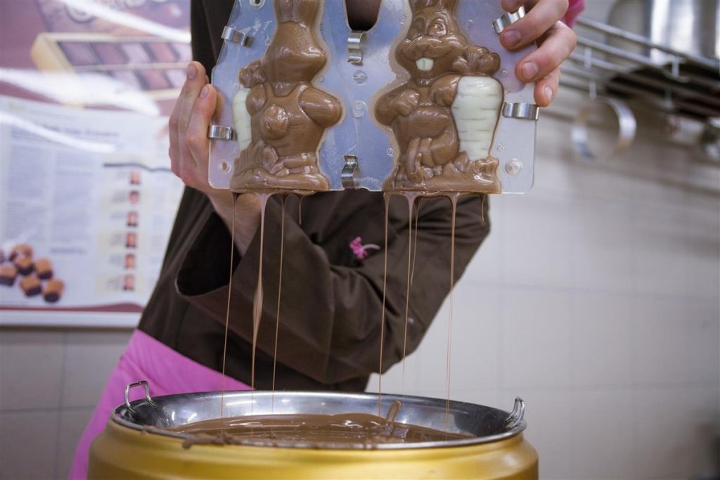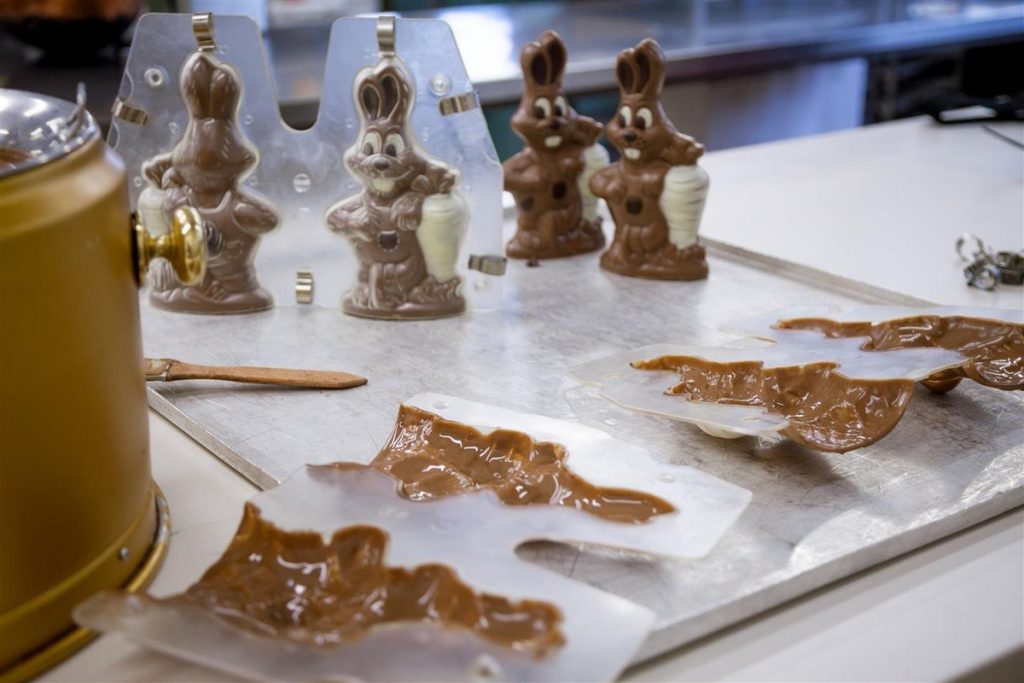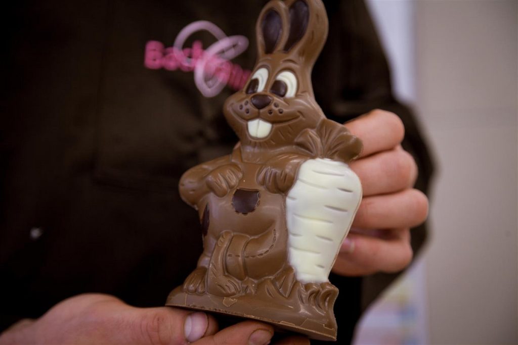 Die Couverture (Fachbegriff für Qualitässchokolade) muss zuerst temperiert (auf 45°C erwärmt, auf 27° abgekühlt und auf 32°C erwärmt) werden und auf 32°C gehalten werden. Die beiden Formhälften werden sauber mit Watte geputzt. Der Osterhase bekommt aus weisser und dunkler Schokolade ein Gesicht und Konturen. Im Fachausdruck nennt man diesen Arbeitsprozess schminken.